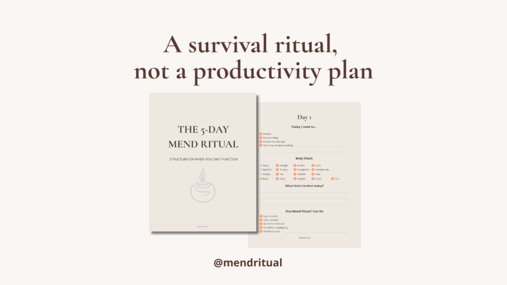 The 5-Day Mend Ritual is a soft, printable planner designed for burnout, shutdown, emotional exhaustion, or just life when it’s too much.